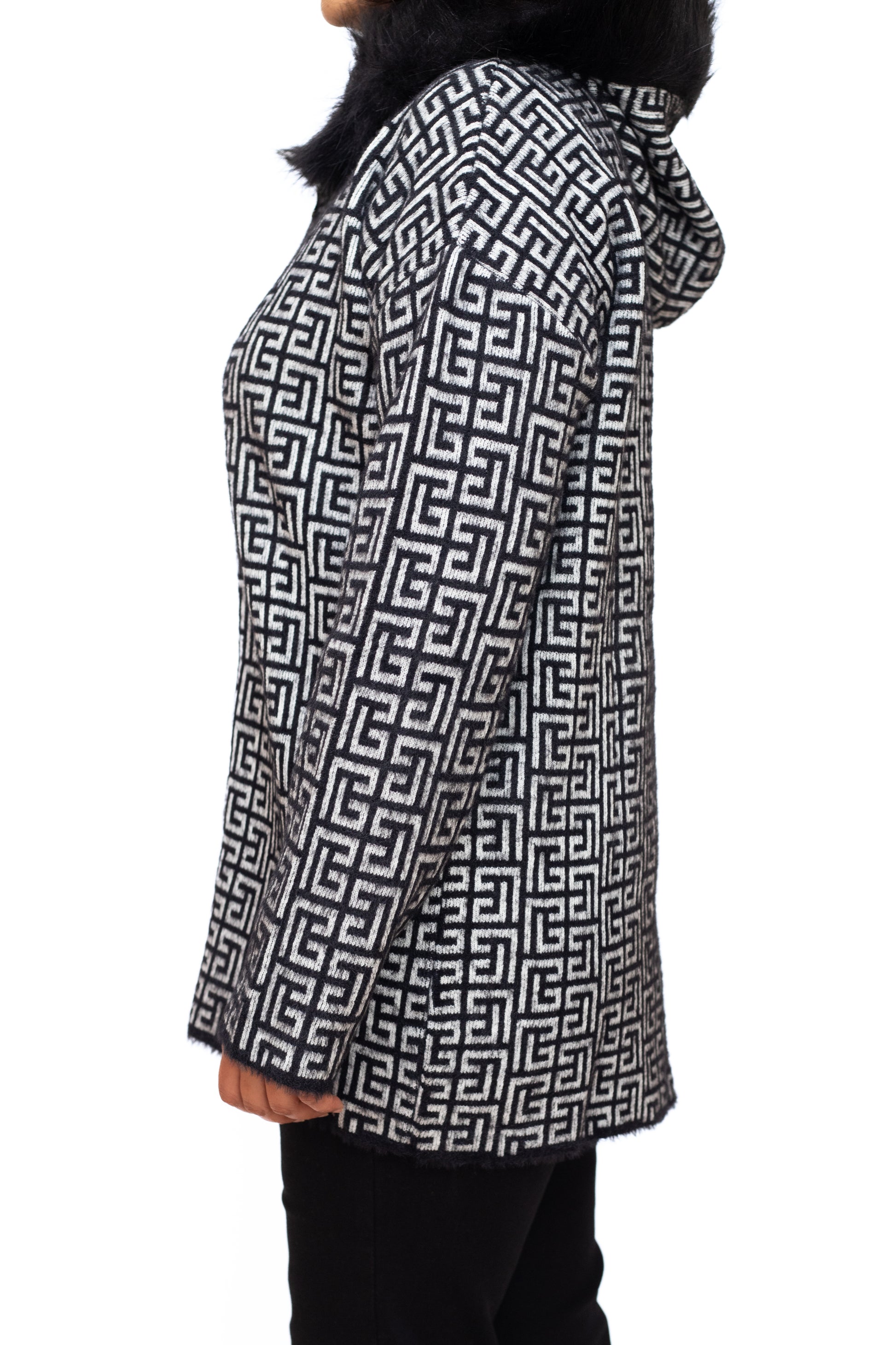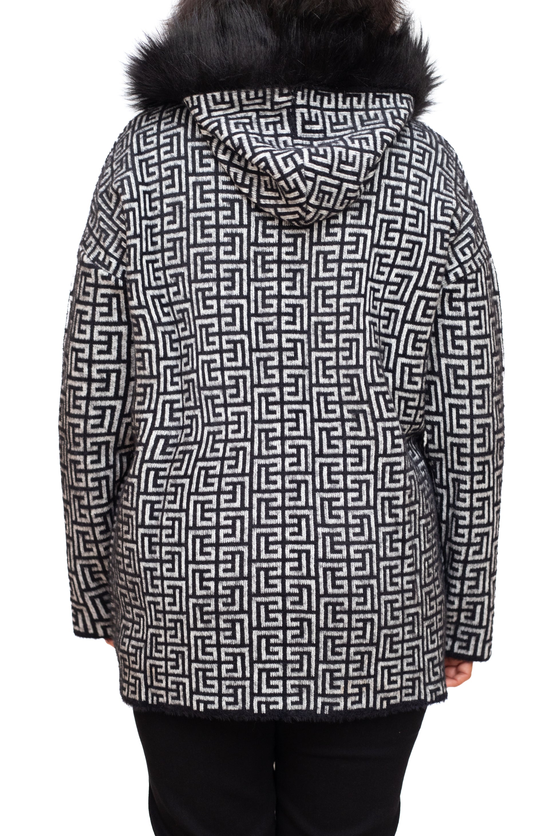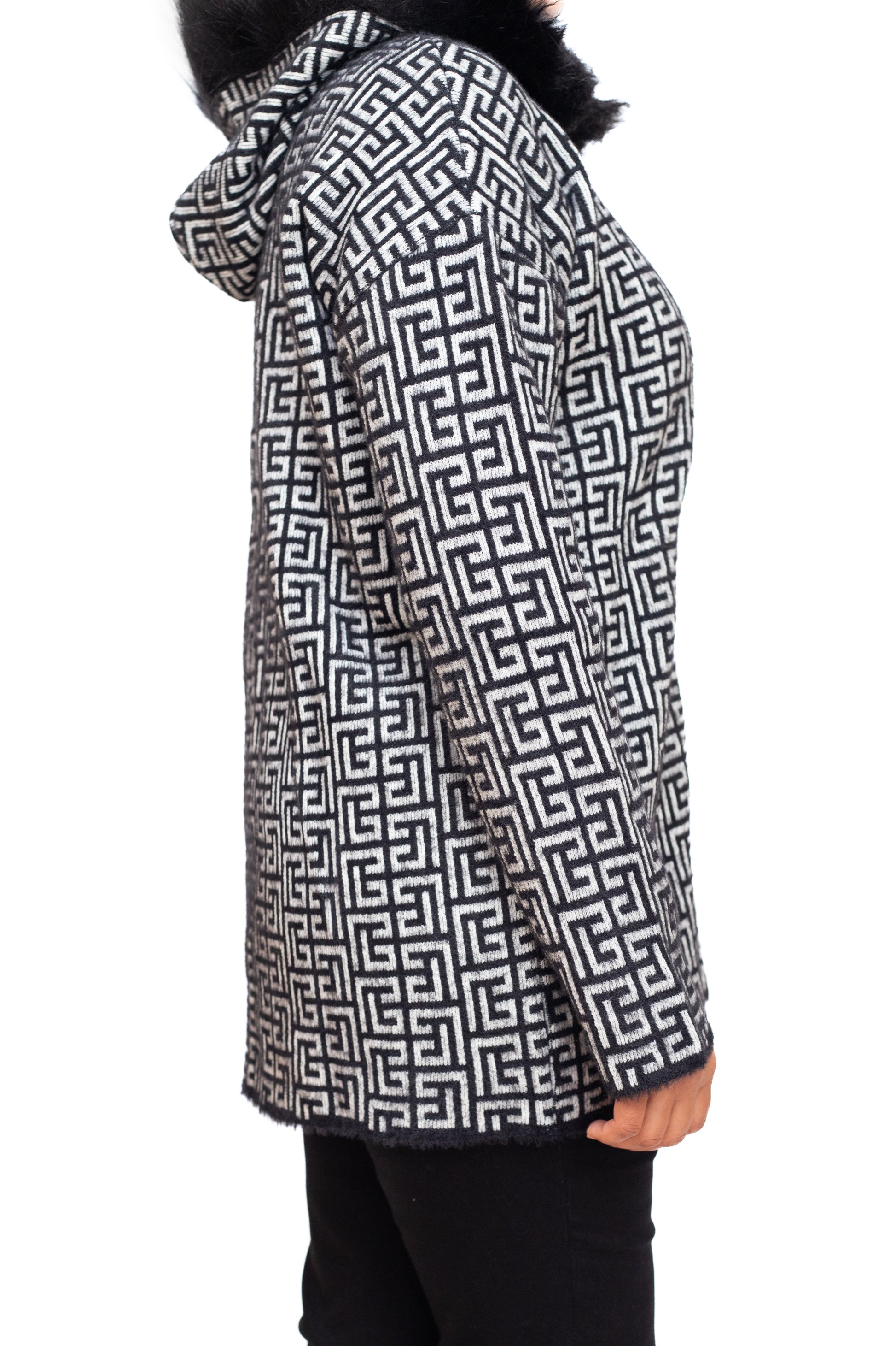 In vogue, elegant black and white patterned jacket with hooded faux fur collar. With smart zip and providing mid-thigh coverage. Will complete any outfit, creating a stunning appearance.